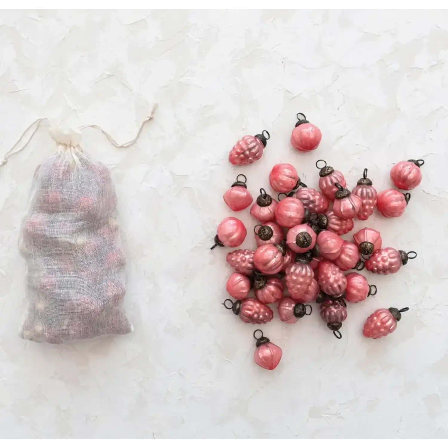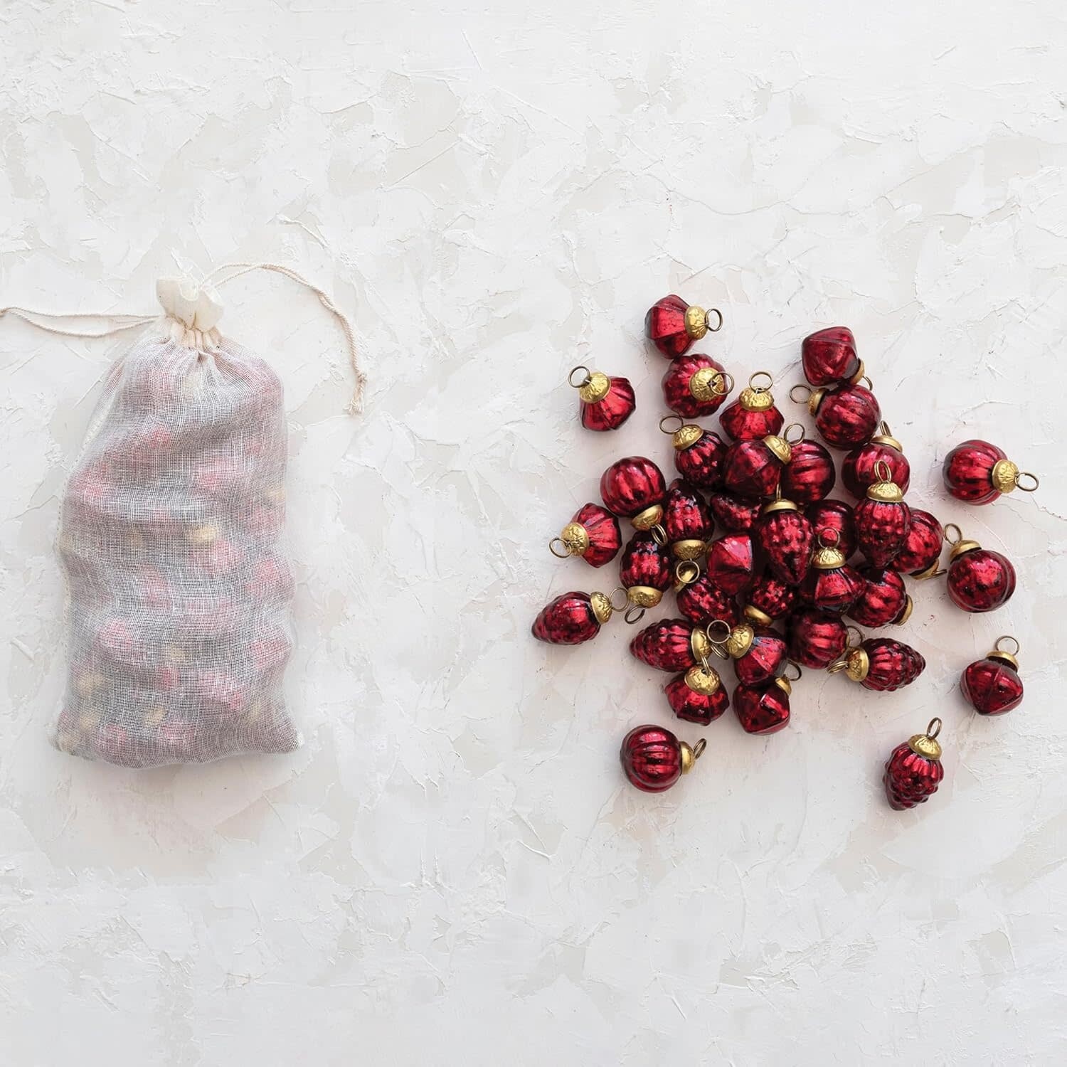Bring timeless elegance to your holiday décor with this set of 36 Embossed Mercury Glass Ornaments, beautifully presented in a charming muslin bag.