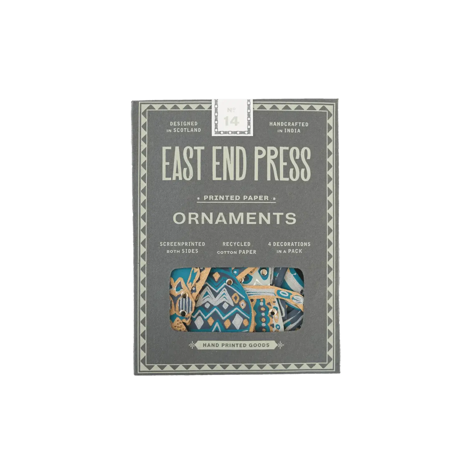 Each oversized ornament features a different design and is designed to fold out creating a three-dimensional paper shape with a cotton hanging loop.