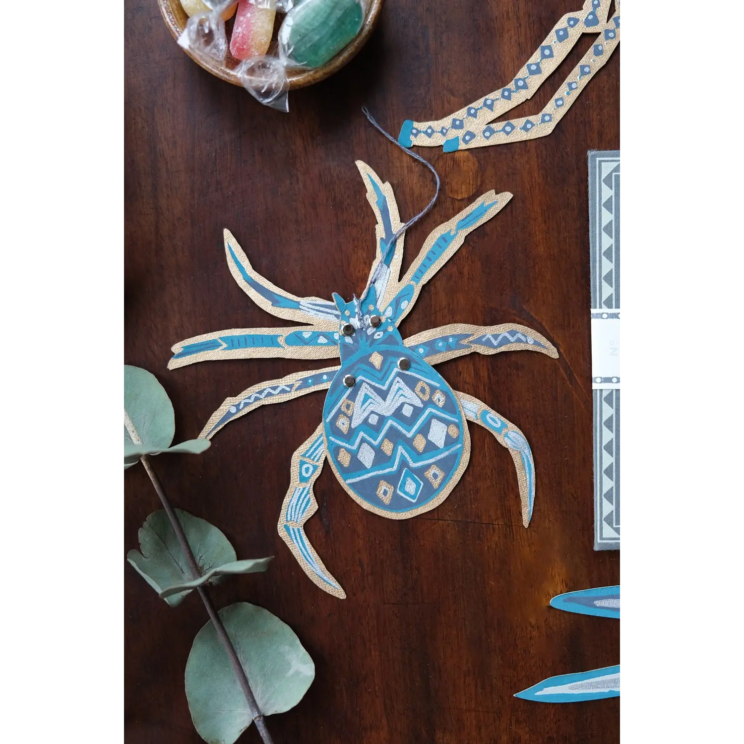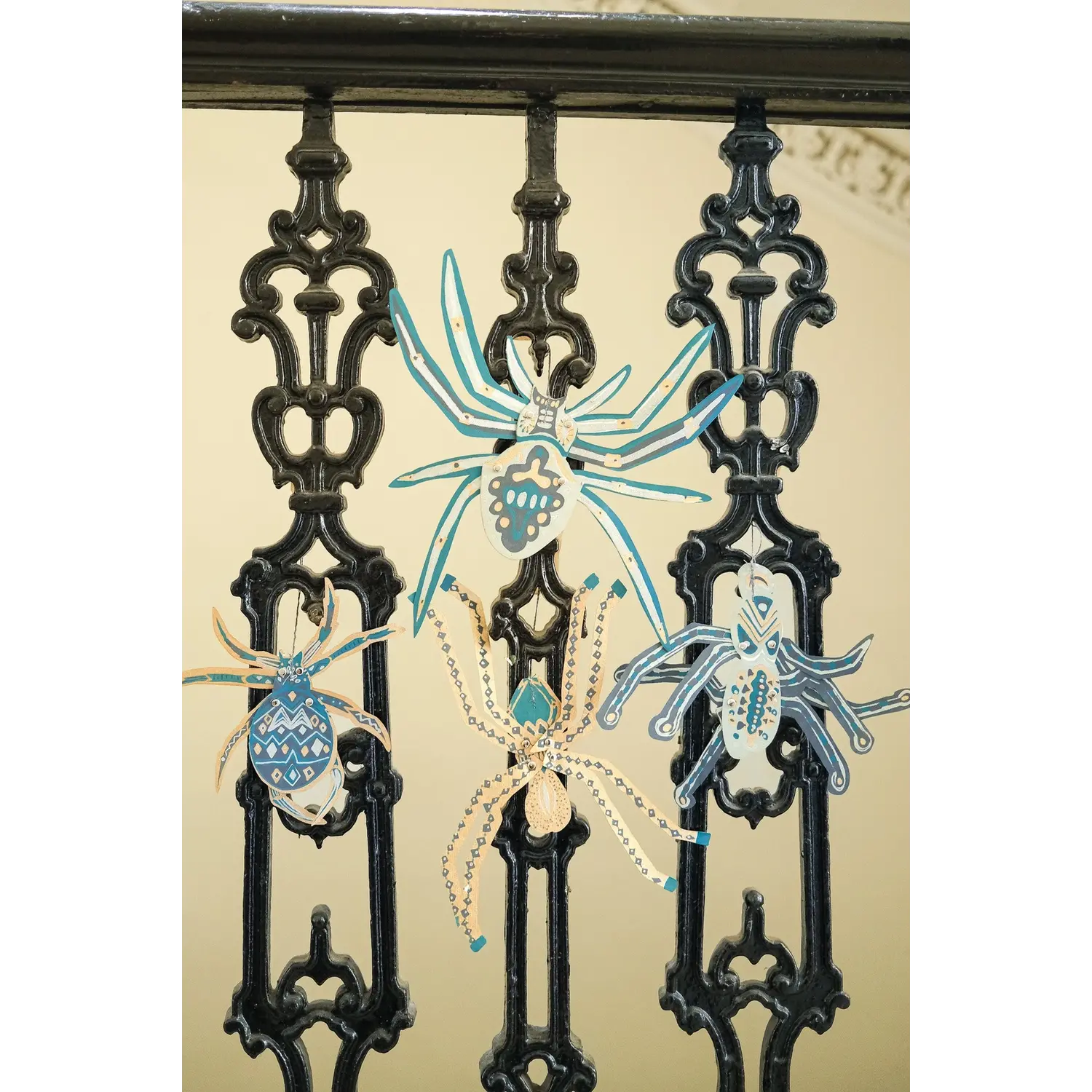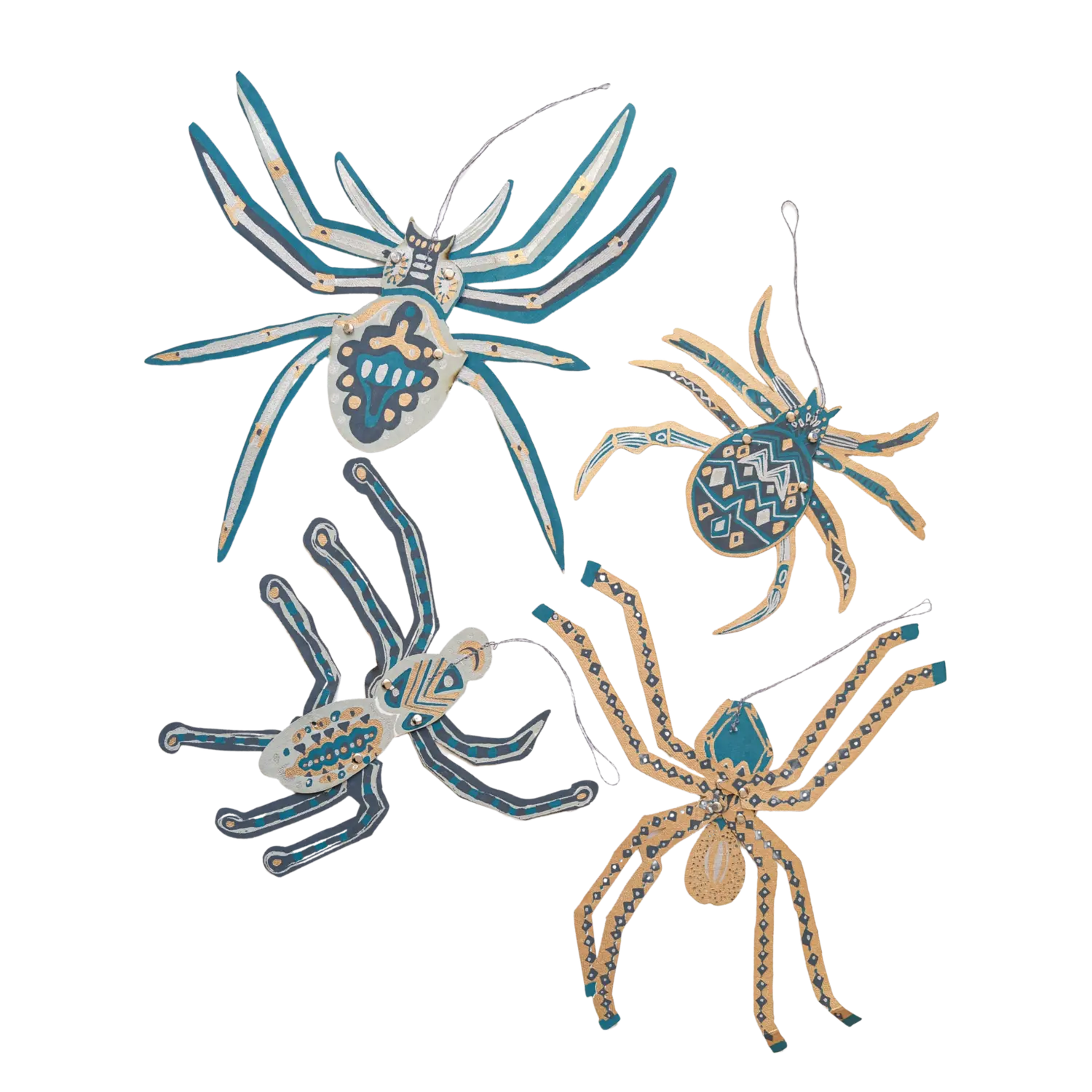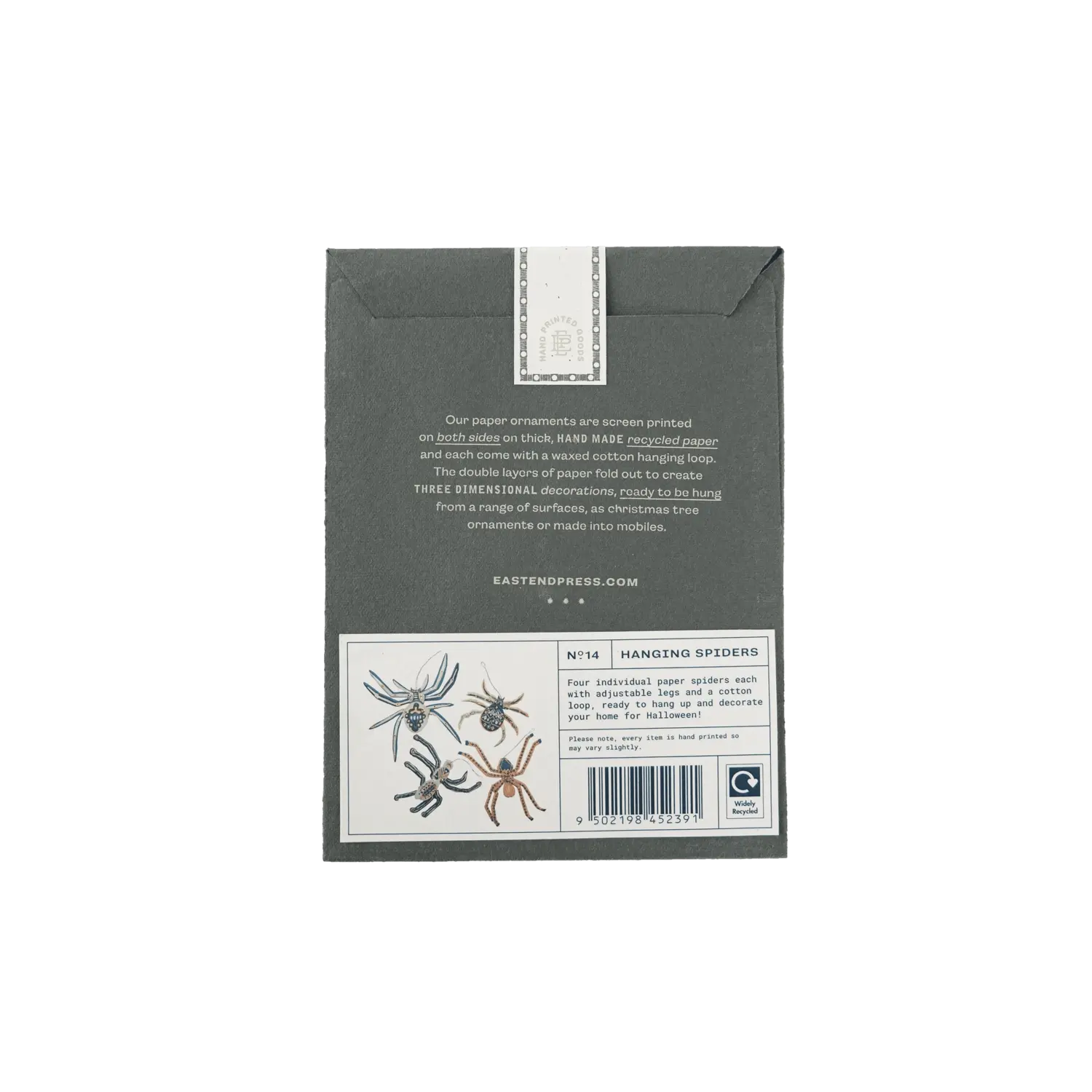 Includes four individual paper spiders, each with adjustable legs with split rivets, ready to hang up and decorate your home for Halloween!