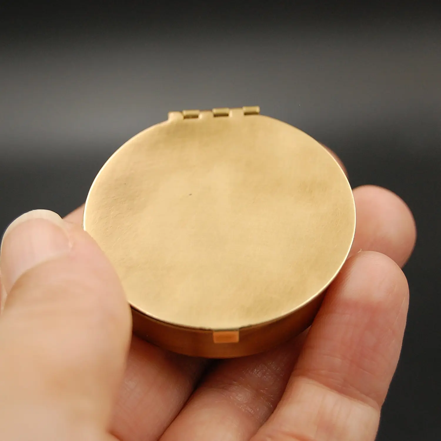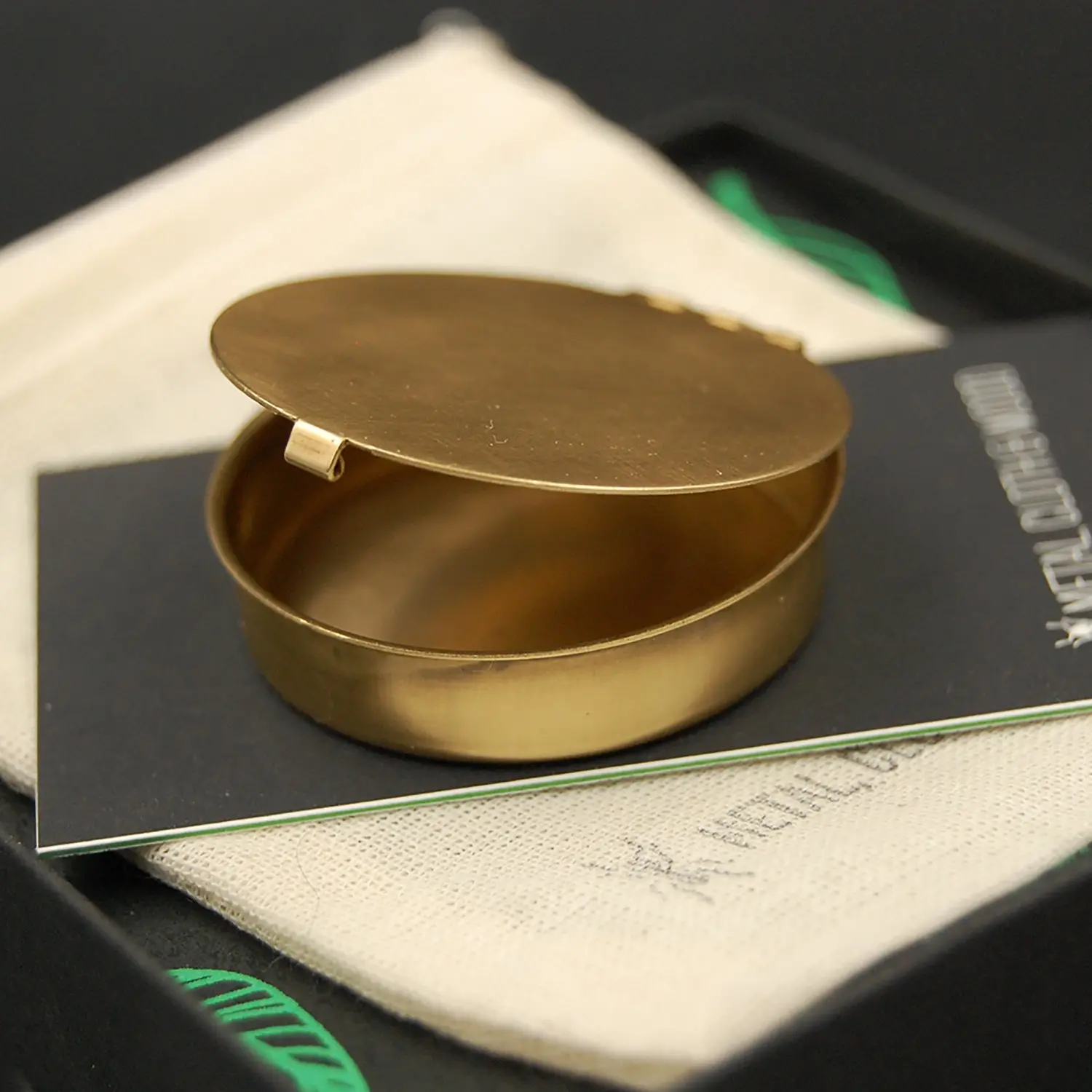 Box is constructed from 100% raw brass and is un-coated on the interior, making it safe for temporary storage of supplements or meds, but please note this box is not air-tight or water-tight, so use your best judgement.