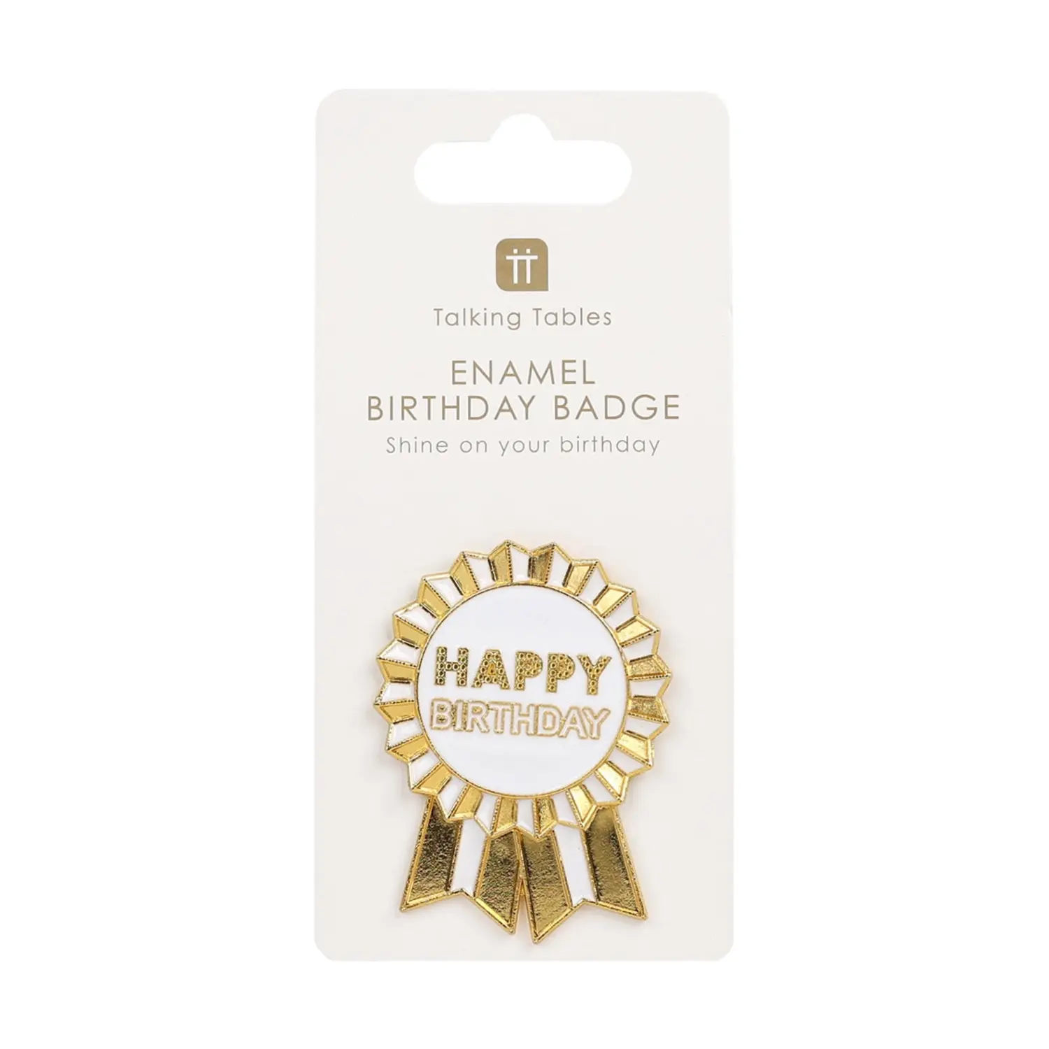 A more polished, grown-up alternative to your average birthday badge, this enamel gold and white pin badge is a classy way to accessorize on the big day.