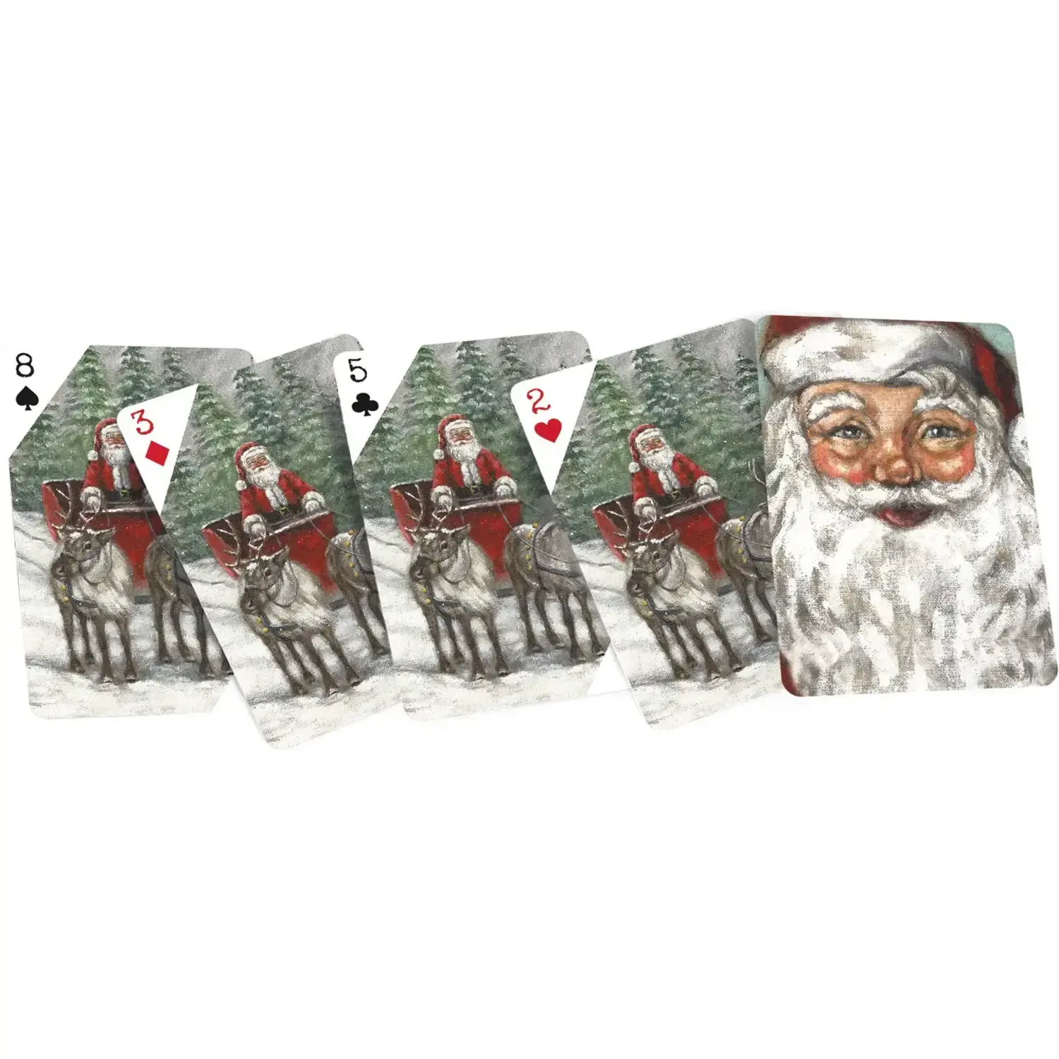 A 54-card playing deck featuring various hand painted Christmas and Santa themed designs replicated from original artwork painted onto burlap canvas, giving the art a unique depth and texture.