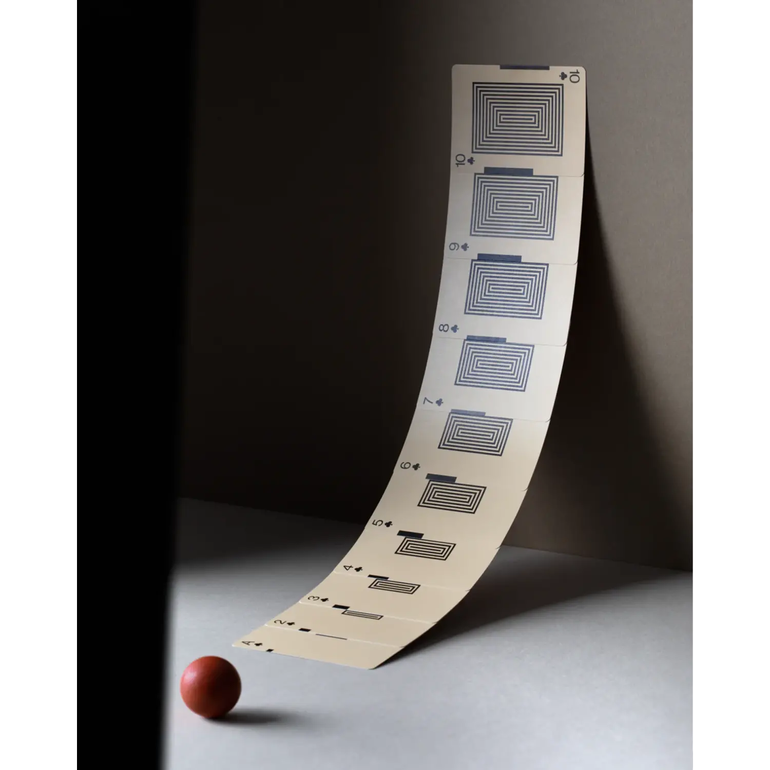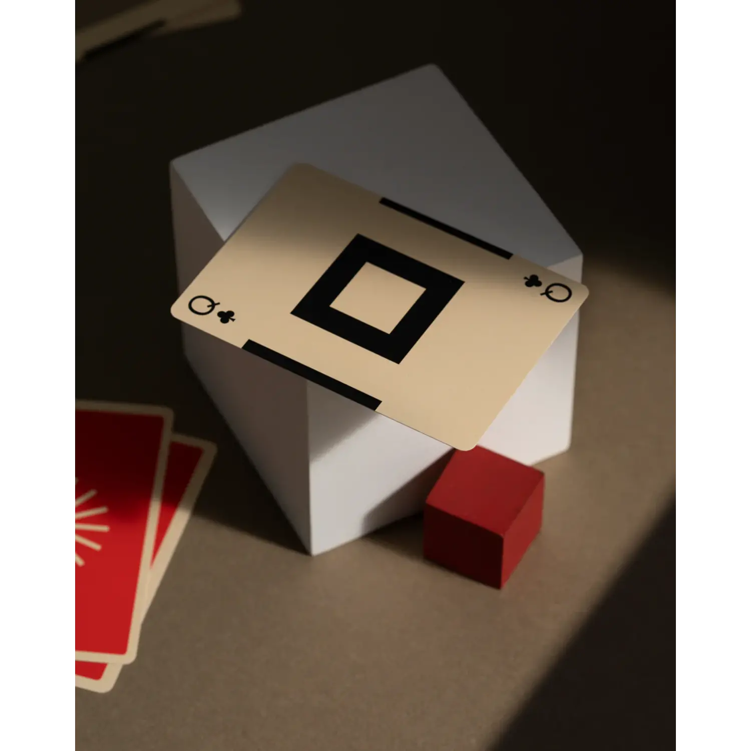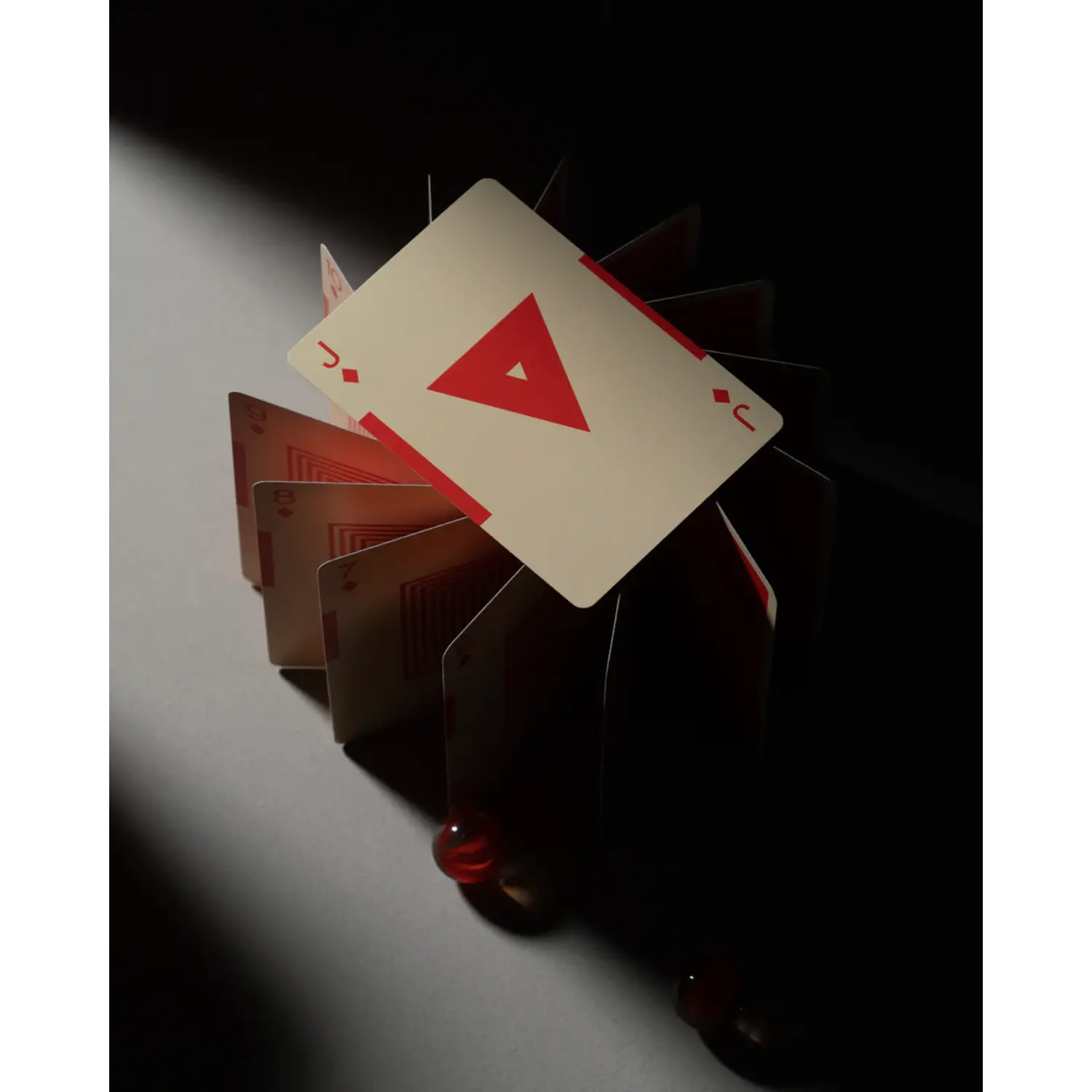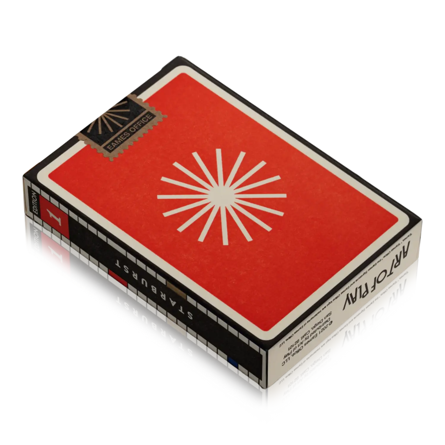 The first edition of Eames Playing Cards showcases the Eames Office Starburst Logo on the backs. This iconic emblem was a recurring motif in the work of both Charles and Ray. Here it signifies their boundless creative energy—an explosion of light reaching for the outer limits of design's true purpose. The unique numbering system on the faces of the cards enables acts of cardistry to function as subtle homages to the Eameses' classic film “Powers of Ten." The court cards honor the natural majesty they found in elemental geometric shapes. Mathematics, form, and the critical role of constraints in design are threads woven throughout the Eameses' life and work.
