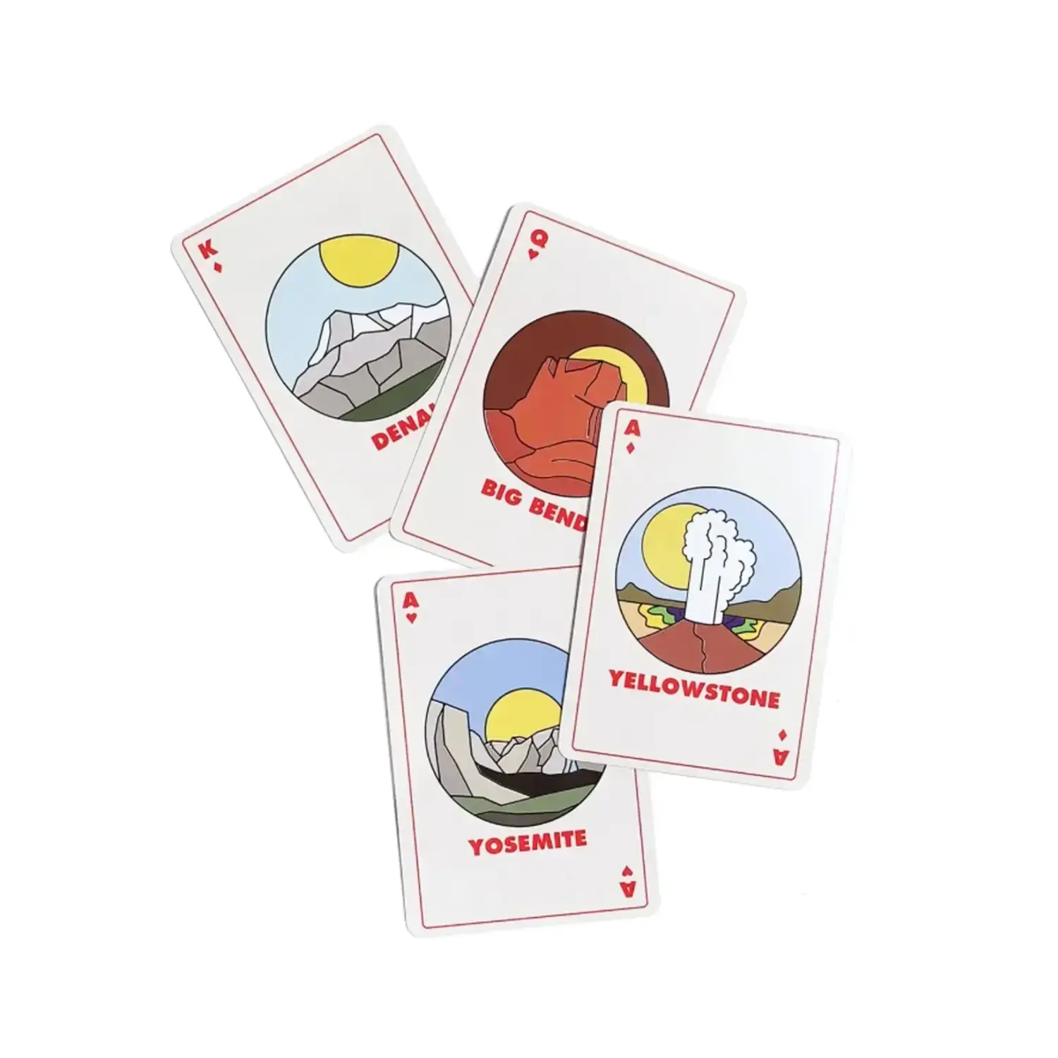 Face cards feature minimalist artwork representing iconic National Parks.