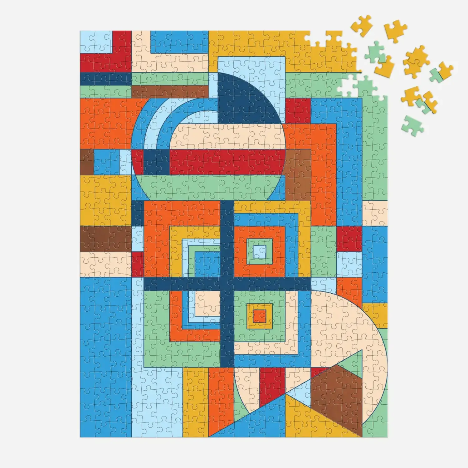 Frank Lloyd Wright December Gifts 500 Piece Book Box Puzzle highlights Wright’s practice of using the tools of his trade: a t-square, triangle and compass, to create lively geometric designs.