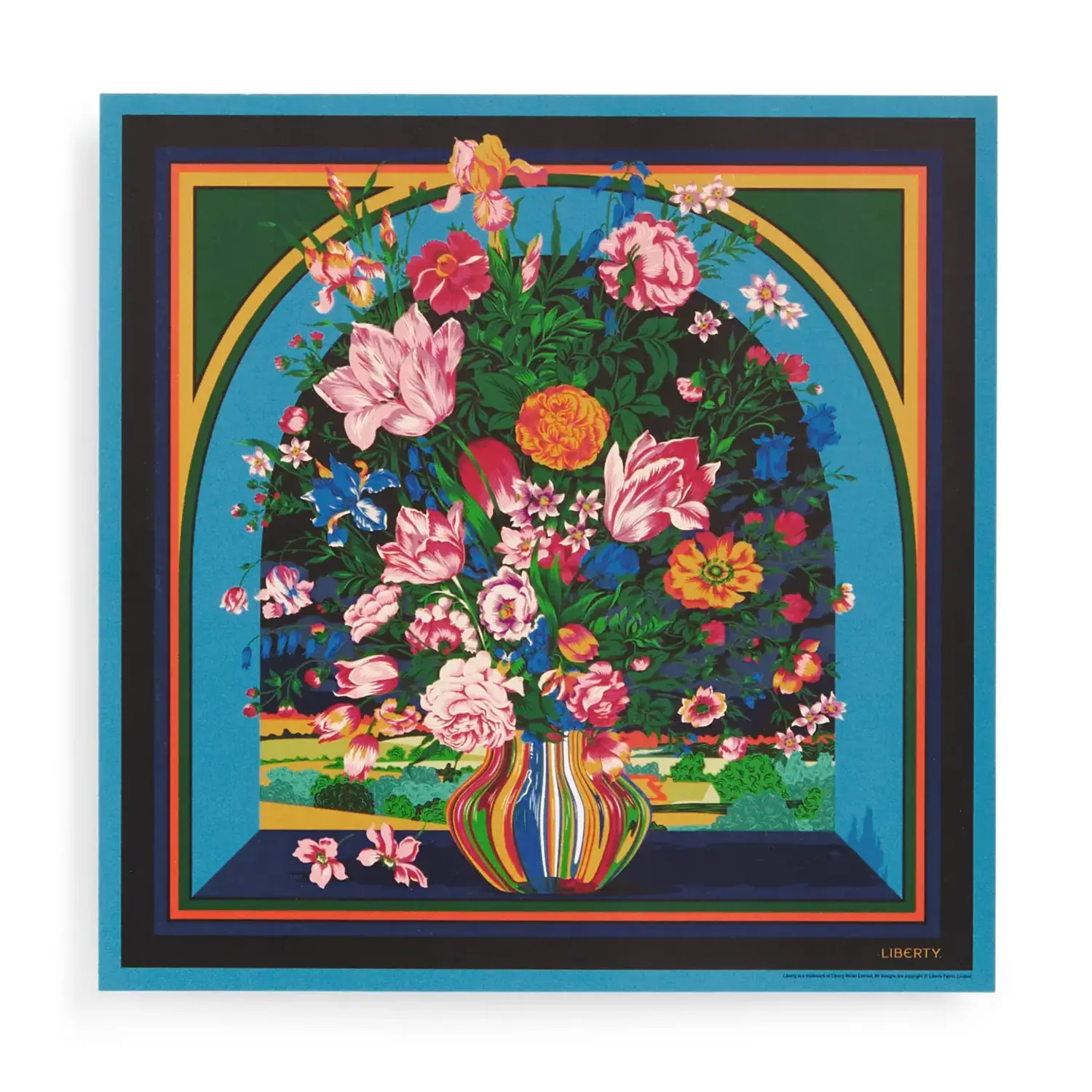 The Liberty Vista 500 Piece Book Puzzle features Liberty’s Vista print, a hand painted scene depicting a view through a window with a floral bouquet at the center.
