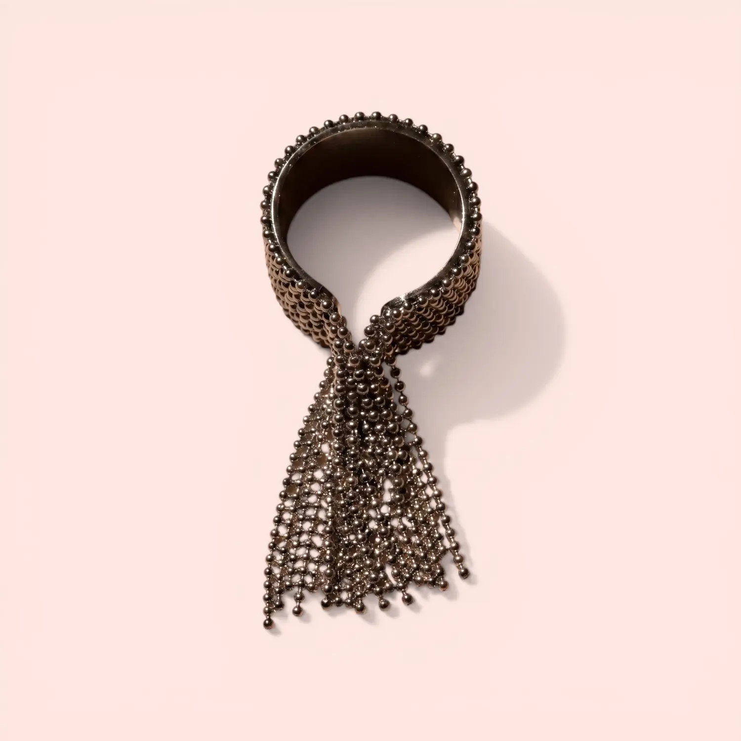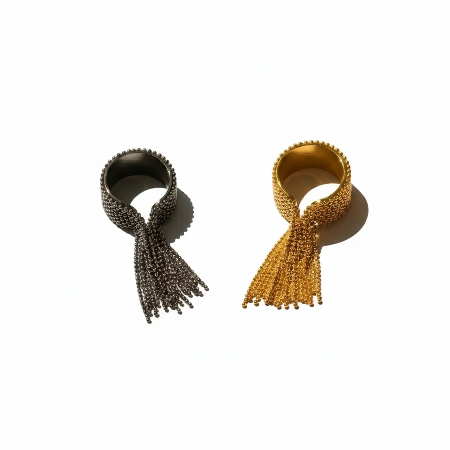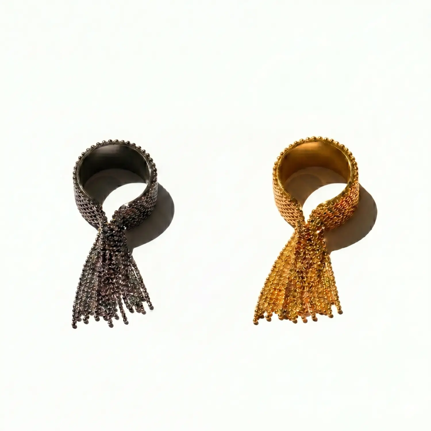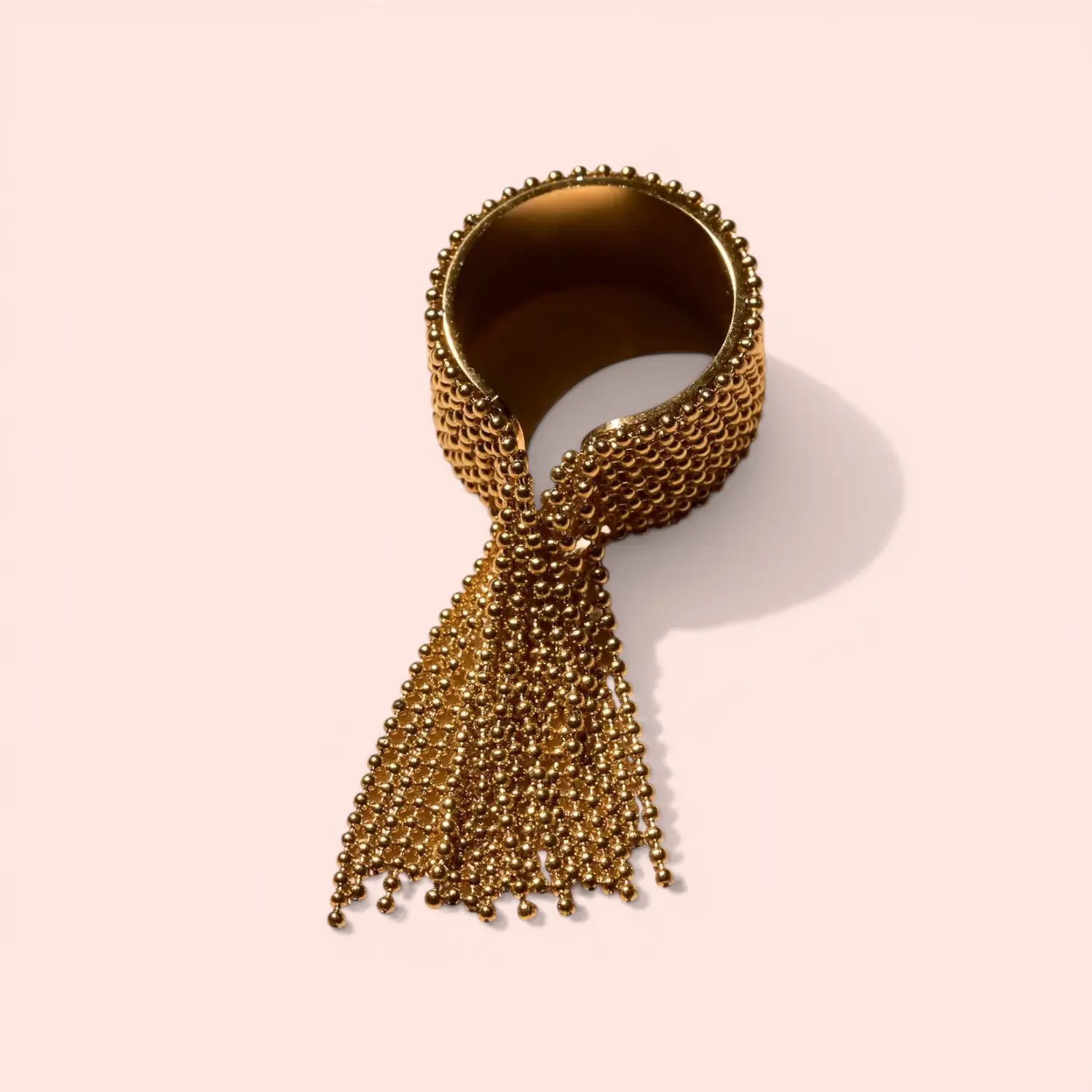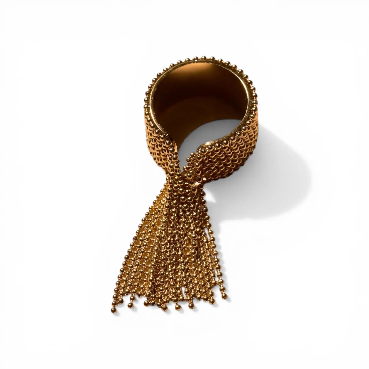 The Daphne Ring features a liquid-metal aesthetic with a fluid, beaded fringe that dances with every gesture.
