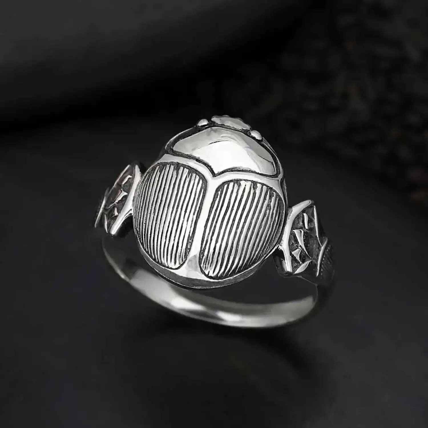 Celebrate the timeless elegance and symbolic power of ancient design with this sterling silver scarab ring, a stunning piece perfect for both men and women.