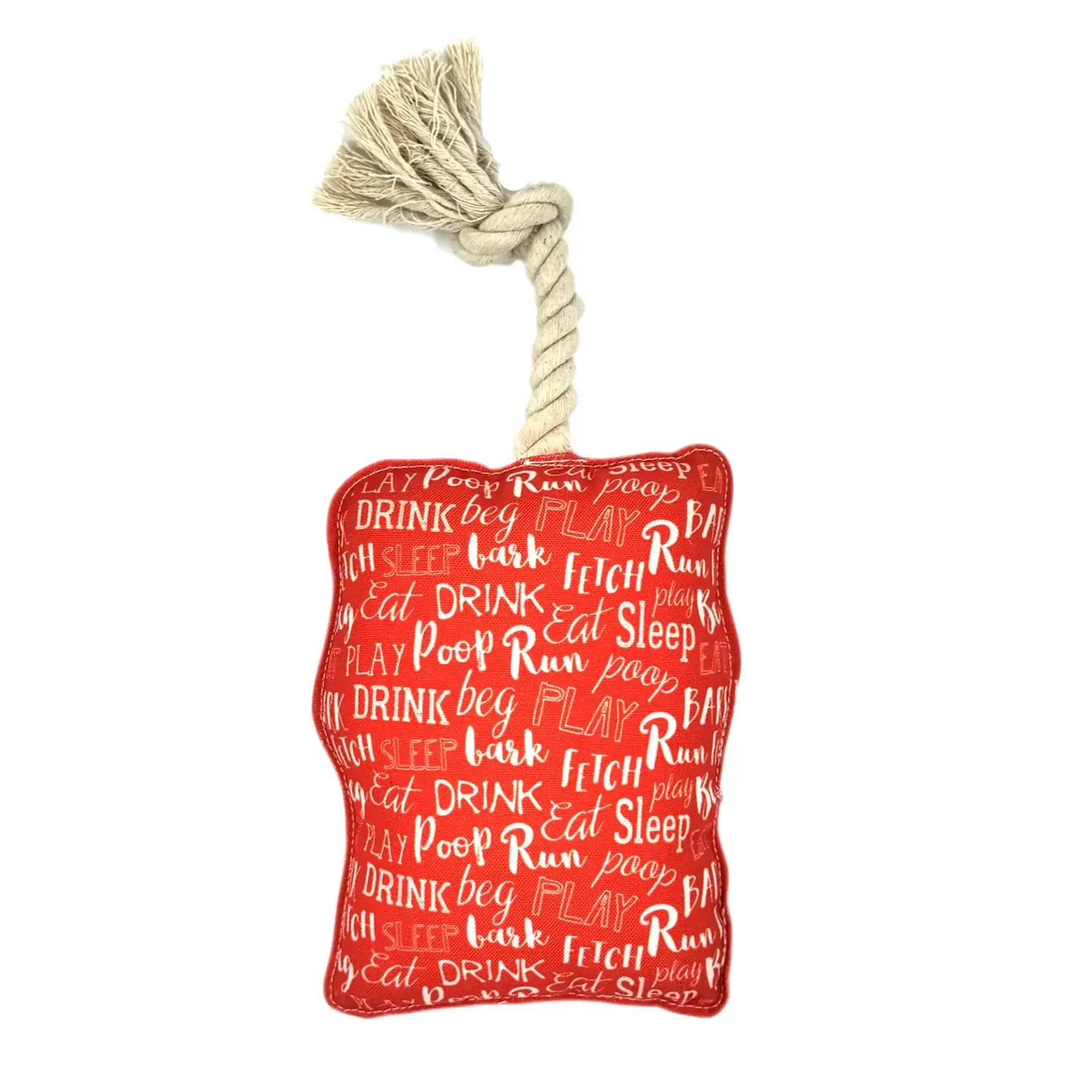 Features recycled cotton stuffing with squeaker, a cotton rope, a durable denier contoured exterior and clever graphics.