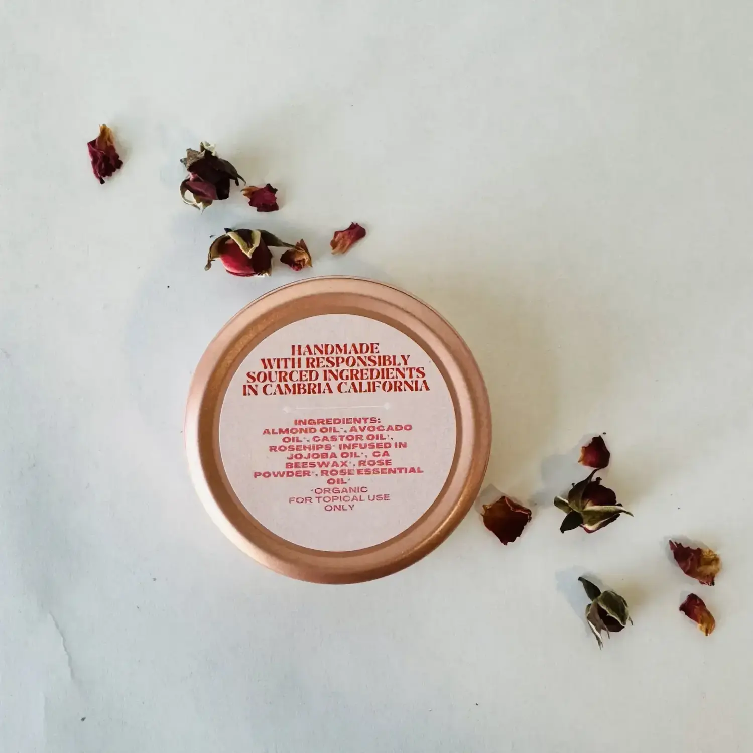 Ingredients: Almond oil*, avocado oil*, castor oil*, rosehips* infused in jojoba*, CA beeswax, rose powder*, essential oils*