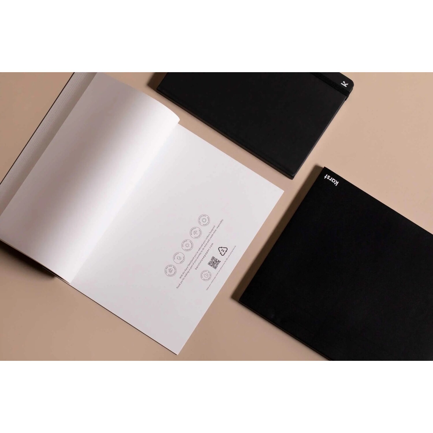 The cover is a luxurious, black vegan leather for a premium look and feel. Equipped with 240gsm thick, bright and waterproof pages, this Sketchpad has the thickest paper within the Karst collection. Practice your charcoal techniques on one page and layer watercolors on the next without worrying about bleed-through.