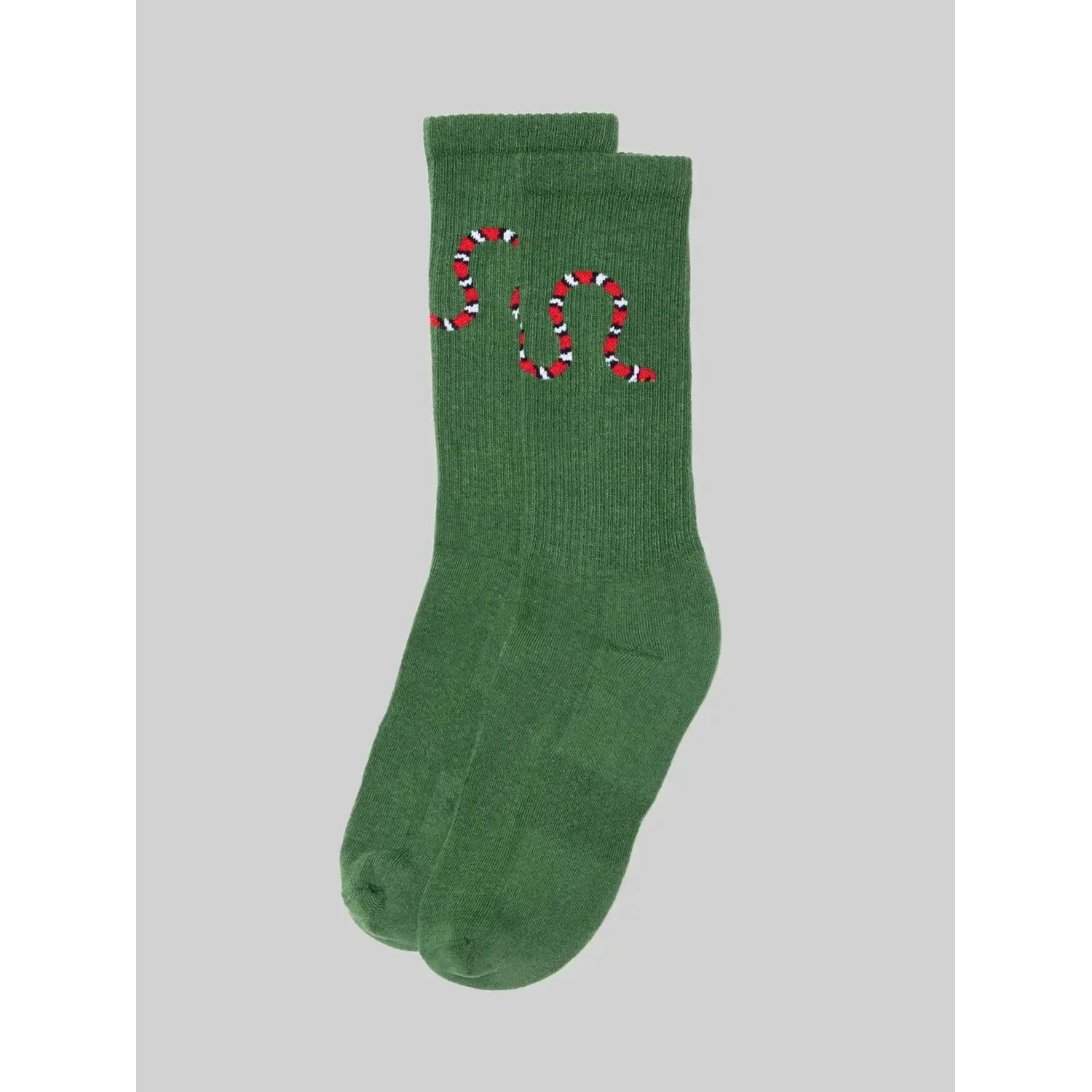 Nature-inspired style features a crisp, intarsia-knit colorful banded Snake on the leg.