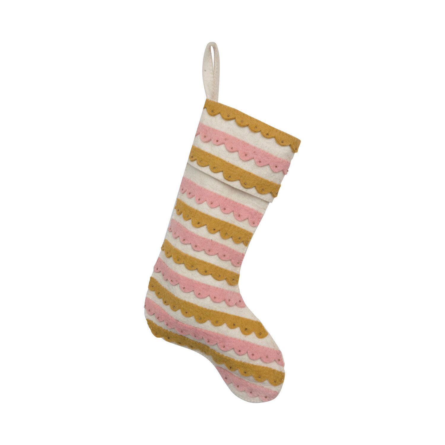 Pink, Cream and Mustard Color Wool Felt Stocking with Appliqued Scallops and Beads.