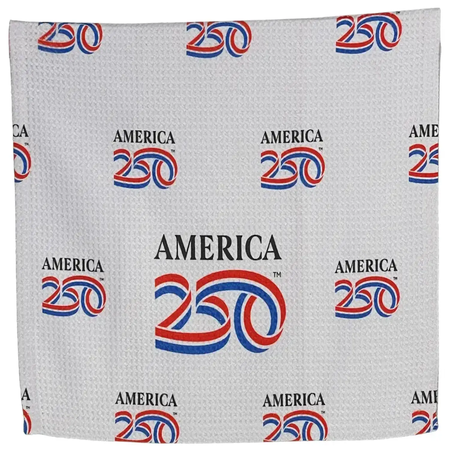 Multi-use microfiber waffle weave towel featuring commemorative America 250 logo.
