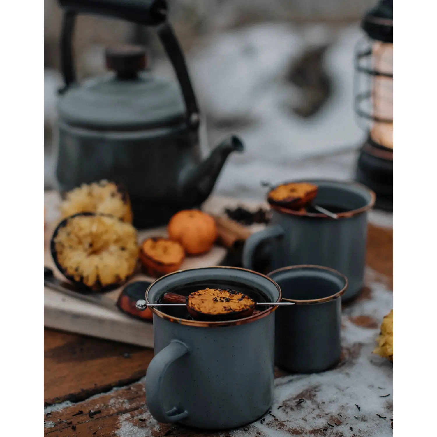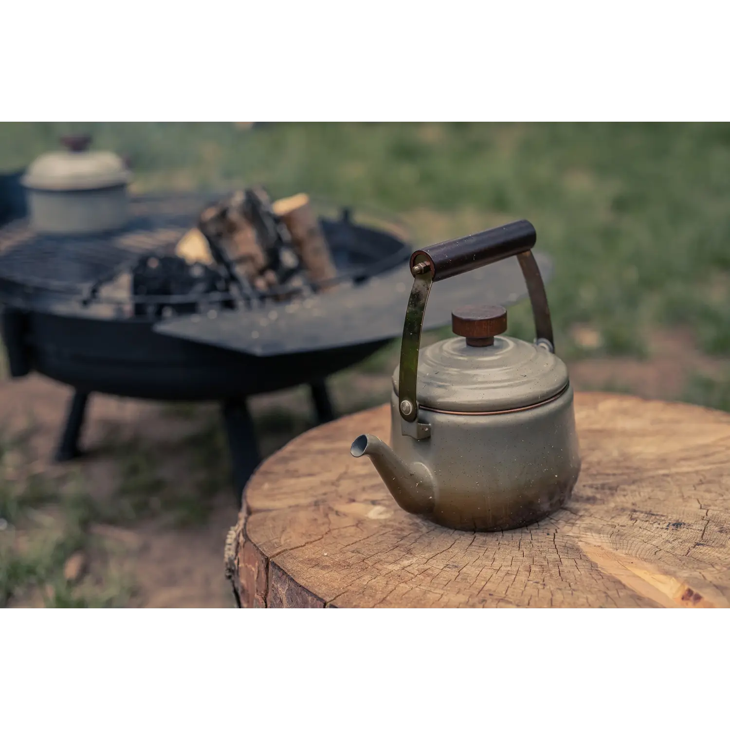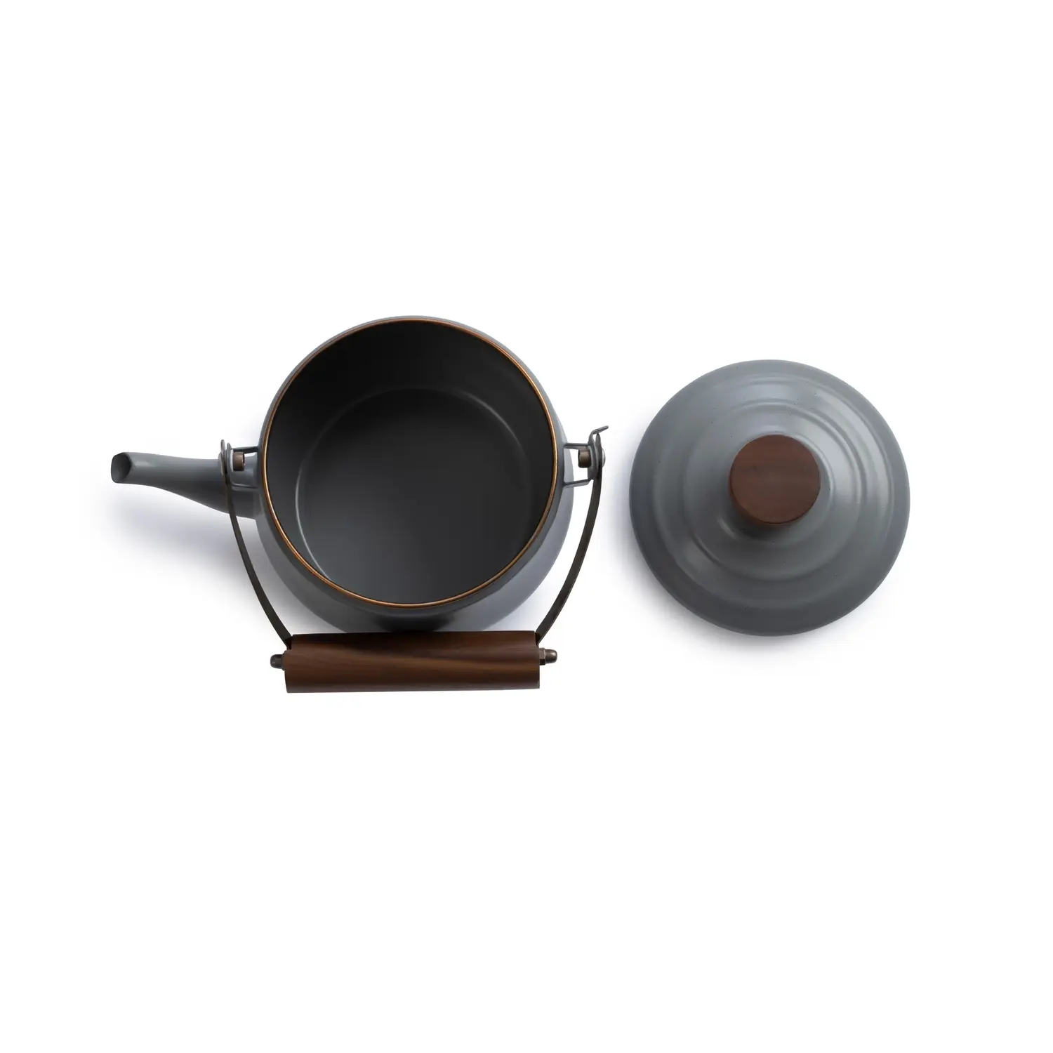 The Teapot features a hand-finished, baked stainless steel trim that creates a copper-like patina finish and matches the full enamelware line.