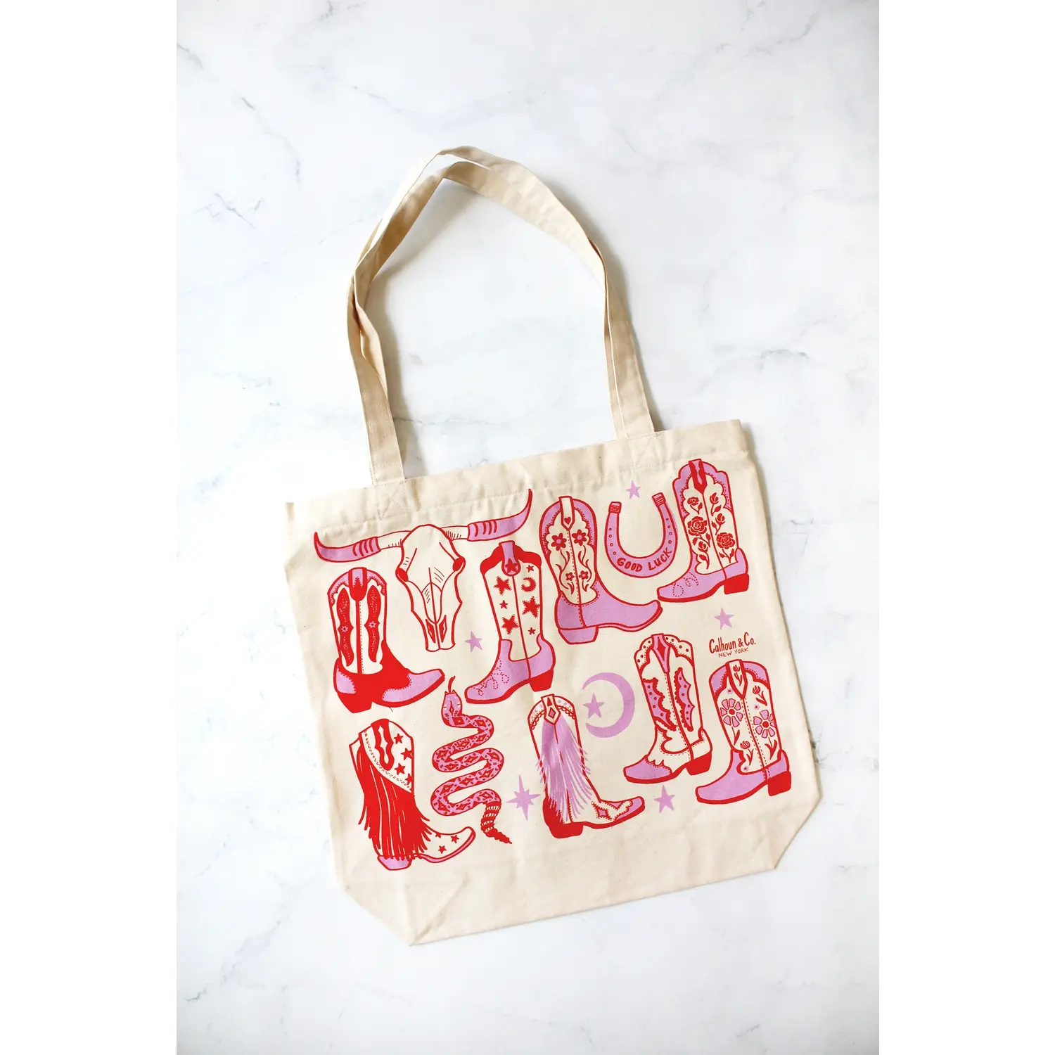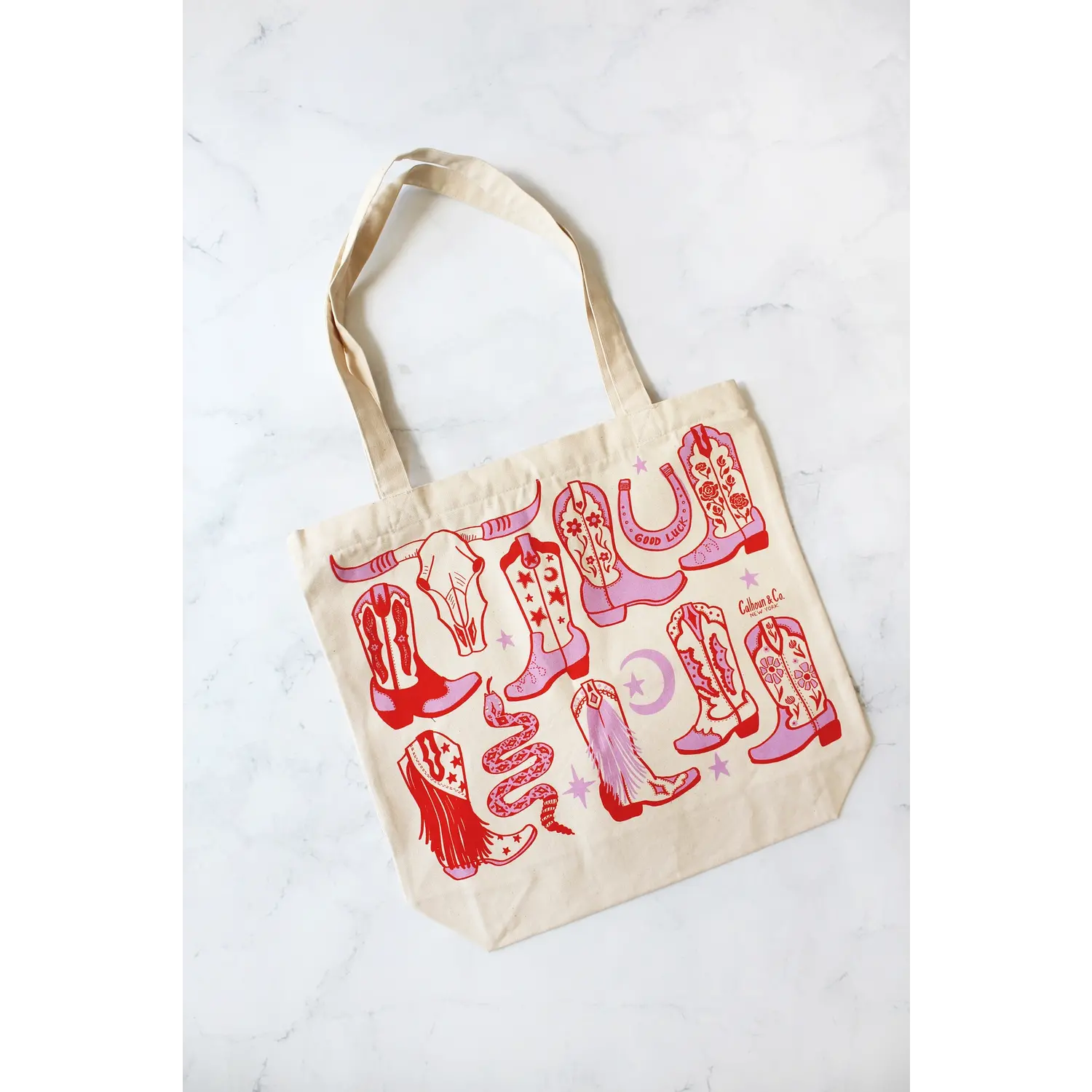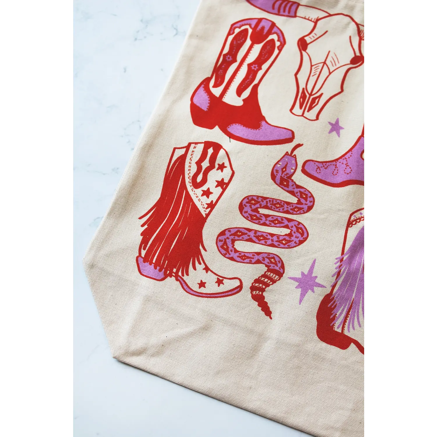 Howdy, Cowgirl! Red and pink screen printed tote bag on cream ground.
