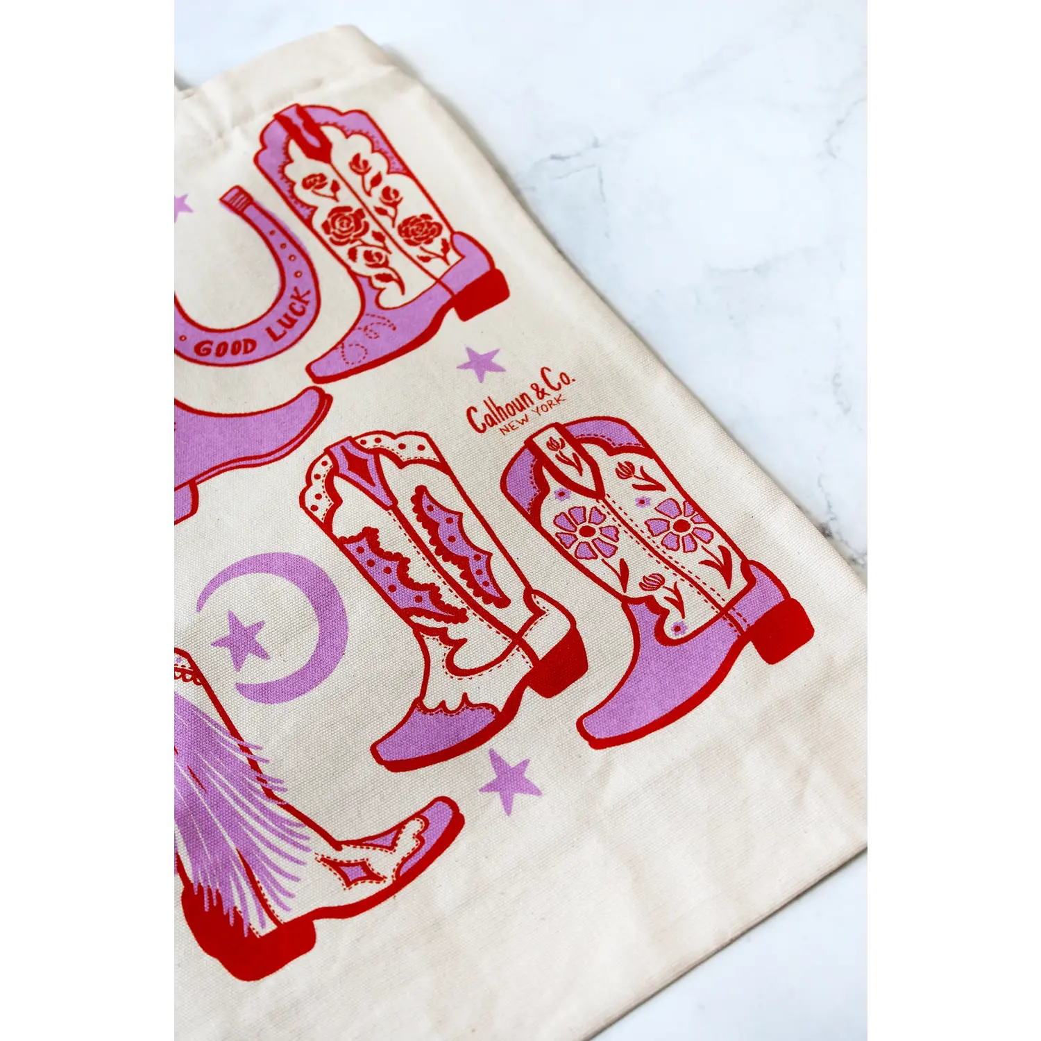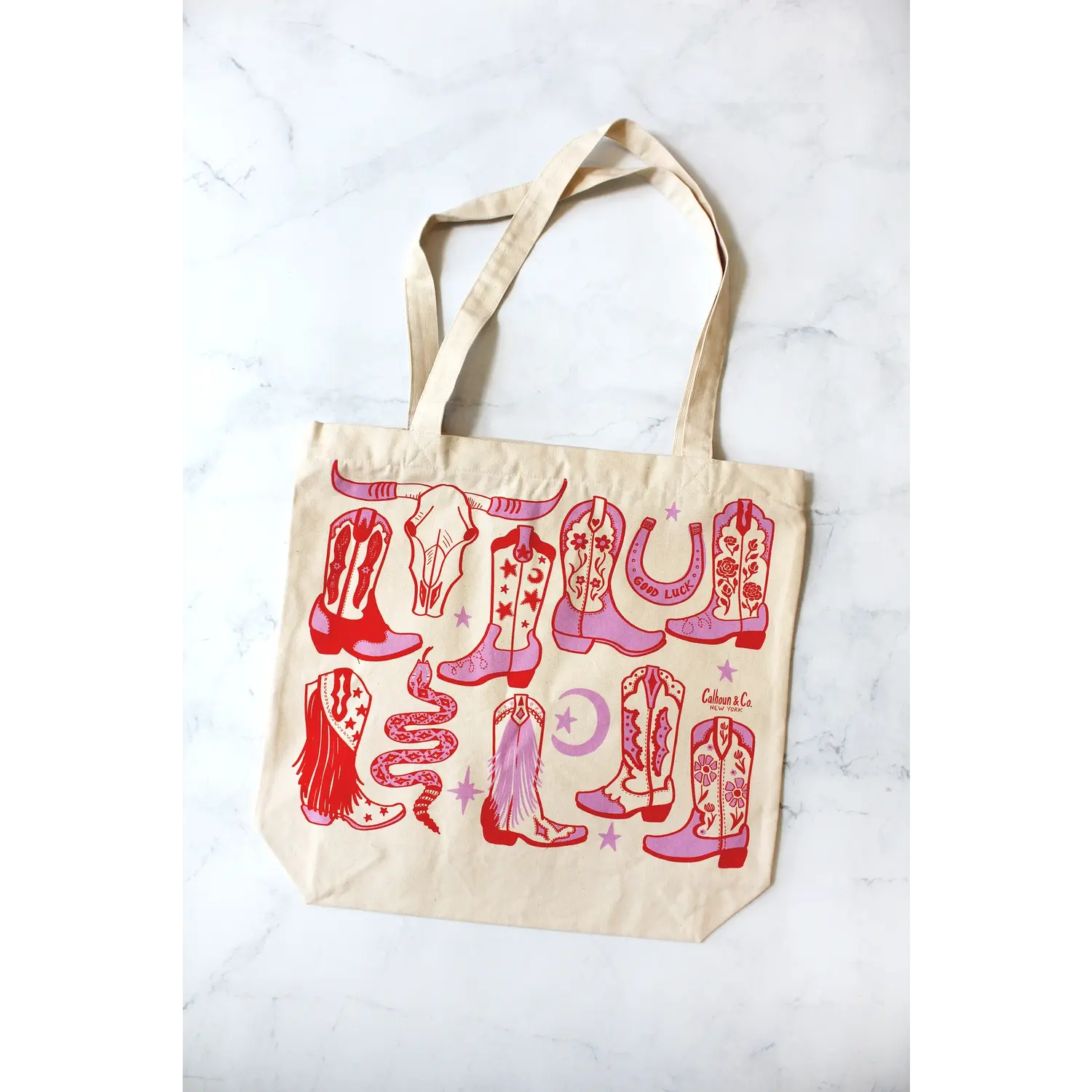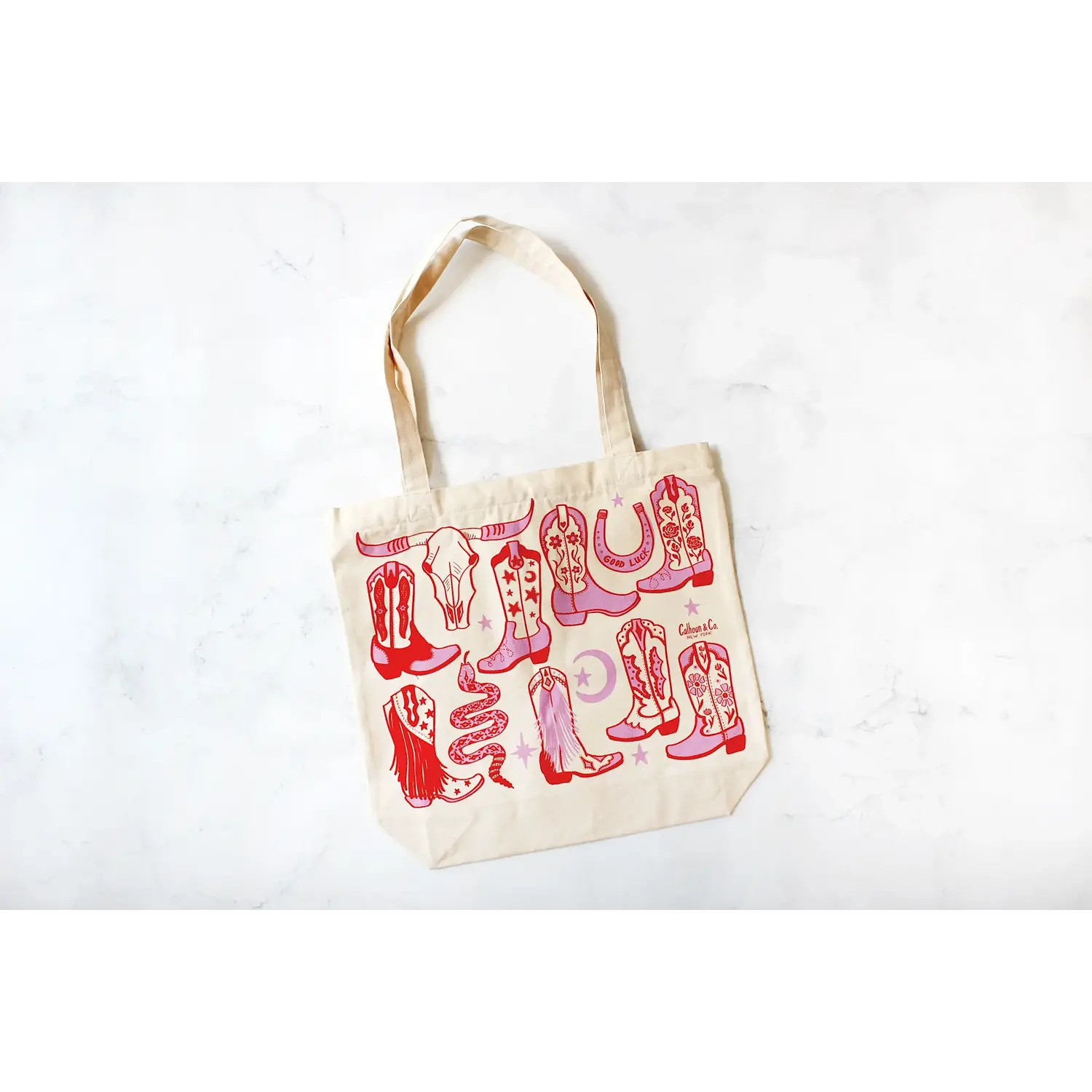 Howdy, Cowgirl! Red and pink screen printed tote bag on cream ground.