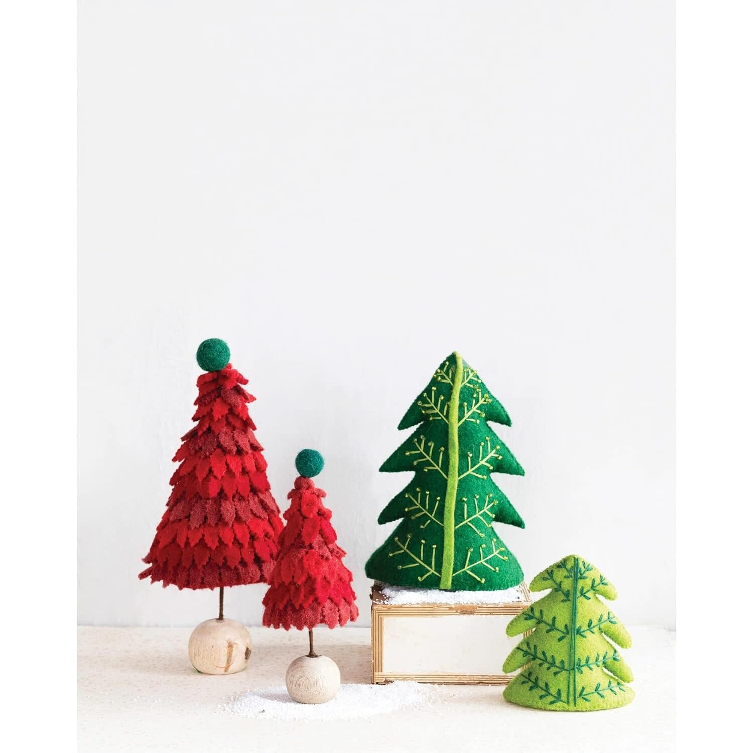 This charming tree figurine, crafted from 100% sustainable wool felt, offers a vibrant, green-on-green hue, complemented by intricate embroidery and applique detailing.