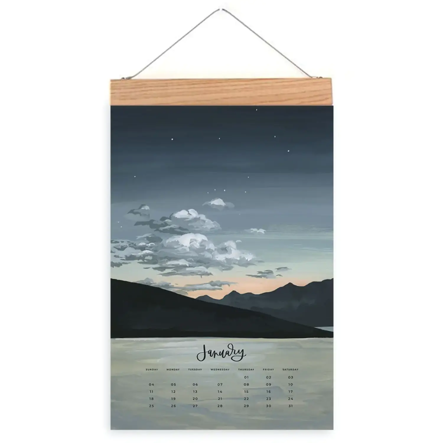 Featuring twelve hand-painted scenes inspired by nature’s quiet wonders—like morel mushrooms, golden fields, snowy rivers, and blooming wildflowers—this oversized calendar brings a peaceful touch to any wall.