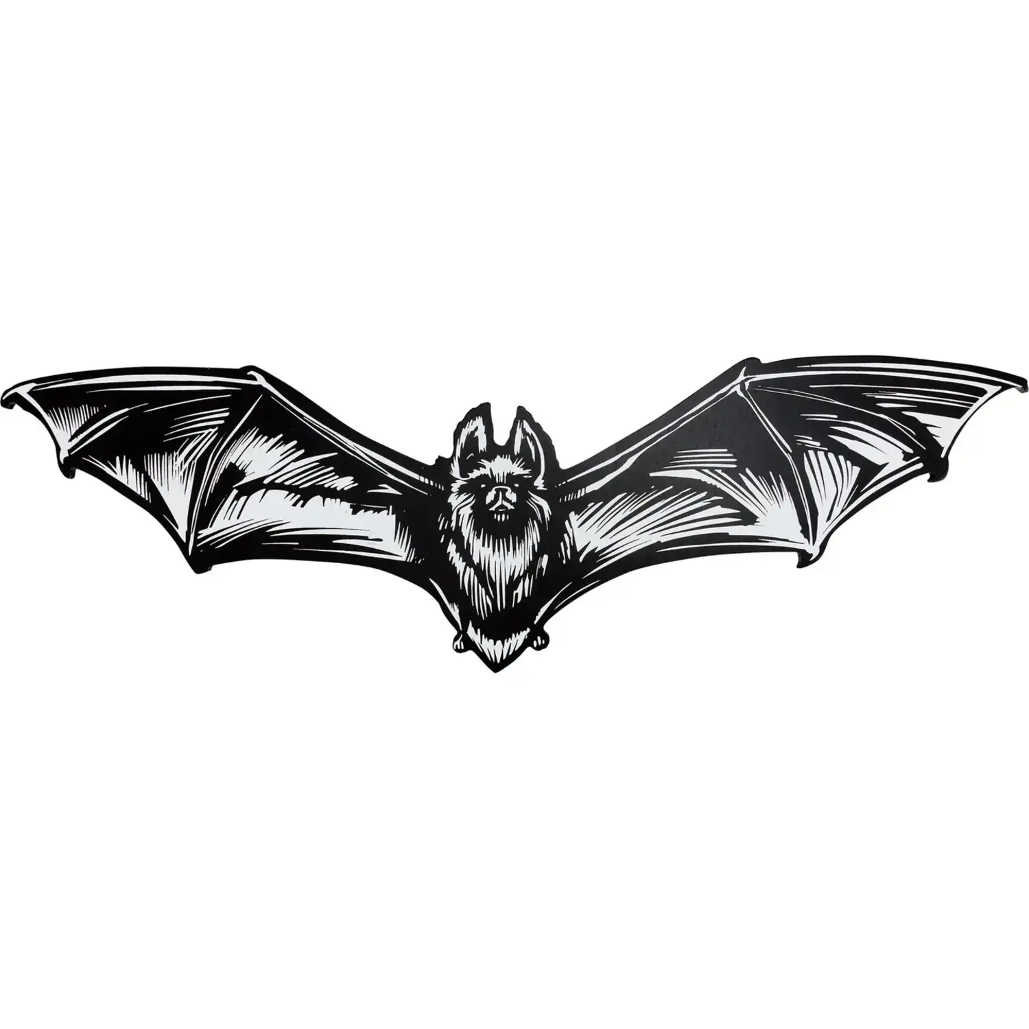Elevate your Halloween decor with this striking wooden wall piece, showcasing a cutout of a hand-illustrated bat in bold black and white.